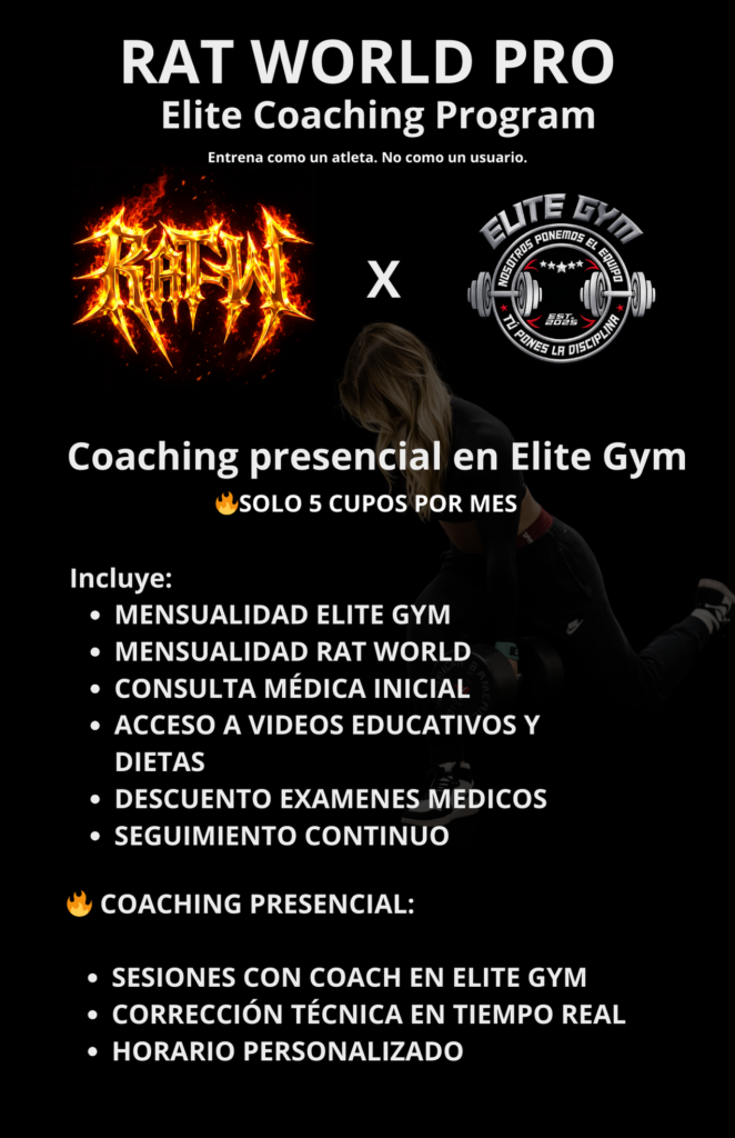 Rat World es un sistema integral de transformación física que integra entrenamiento, nutrición y seguimiento estructurado, respaldado por médico certificado, nutrióloga certificada y apoyo de coaches deportivos especializados, para lograr resultados reales y sostenibles.